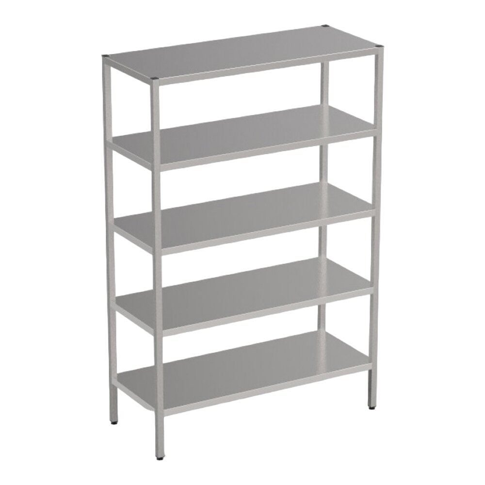 Посилений металевий стелаж на п’ять рівнів призначений для зберігання кухонного інвентарю, посуду та продуктів у виробничих і складських приміщеннях. Надійна конструкція витримує підвищені навантаження.