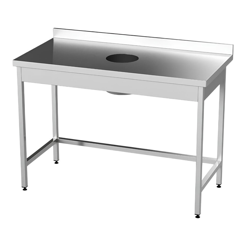Професійний стіл з бортиком та технологічним отвором для зручного збору відходів у процесі приготування продуктів.