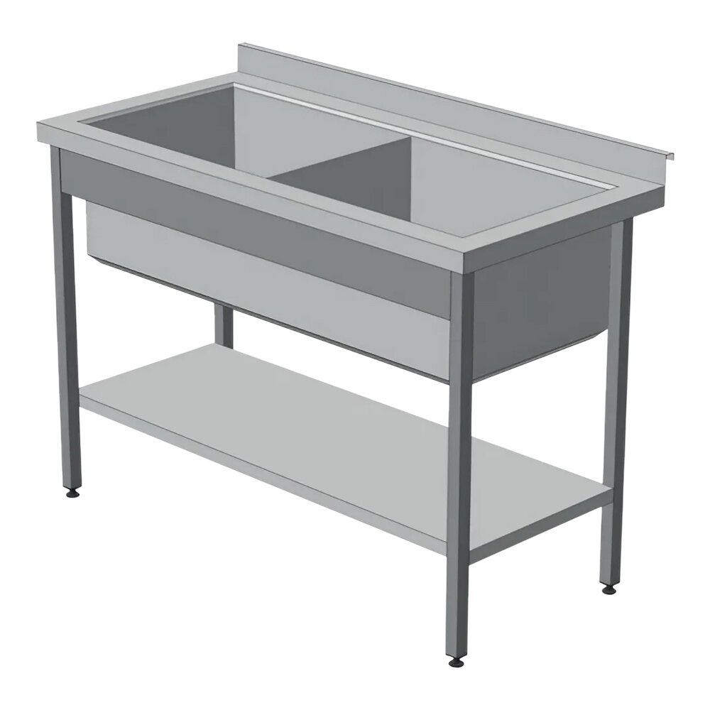 Двосекційна мийна ванна з бортиком і нижньою полицею забезпечує зручну організацію робочого простору на професійній кухні. Виготовлена з нержавіючої сталі.