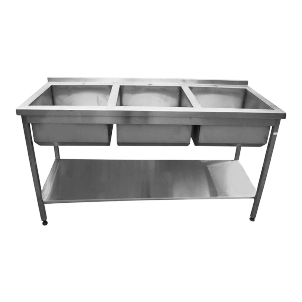 Професійна трисекційна мийна ванна з полицею, призначена для поетапного миття посуду у закладах громадського харчування. Надійна конструкція з нержавіючої сталі забезпечує довгий термін експлуатації.